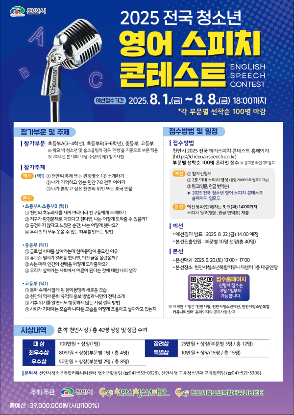 [충청뉴스 유규상 기자] 천안시청소년재단(대표이사 한상경) 천안시청소년복합커뮤니티센터(관장 윤여숭)는 전국 청소년을 대상으로 ‘2025 전국 청소년 영어스피치 콘테스트’를 개최한다.