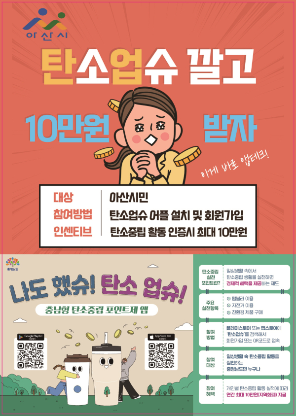 적립된 포인트는 연 2회 지급되며, 1만원부터 연 최대 10만원까지 받을 수 있으며, 참여를 원하는 시민은 스마트폰 앱 스토어에서 ‘탄소업슈’앱을 다운로드 받아 회원가입 후 이용할 수 있다.
