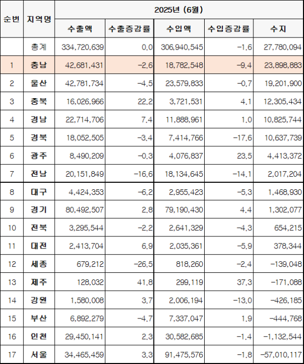[충청뉴스 박영환 기자] 충남도가 수출 427억 달러, 수입 188억 달러를 기록해 무역수지 239억 달러 흑자를 달성해 전국 17개 시도 중 무역수지 1위를 기록했다고 밝혔다.
