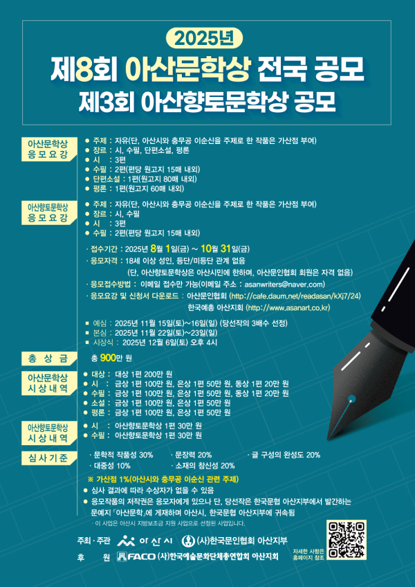 [충청뉴스 유규상 기자] 아산시 주최, (사)한국문인협회 아산지부(지부장 손애정) 주관, (사)한국문화예술단체총연합회 아산지회가 후원하는 총 상금 900만원 규모의 ‘제8회 아산문학상 전국공모’ 및 ‘제3회 향토문학상 공모’가 8월 1일부터 10월 31일 자정까지 참가 작품을 모집한다.