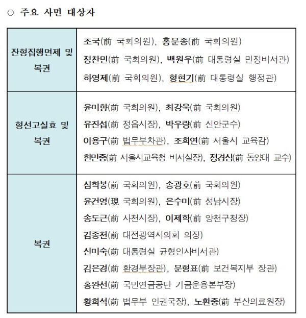 또 조 전 대표의 아내인 정경심 전 동양대 교수와 최강욱·윤미향 전 의원, 조희연 전 서울시 교육감 등도 예상대로 사면 대상에 포함됐다.