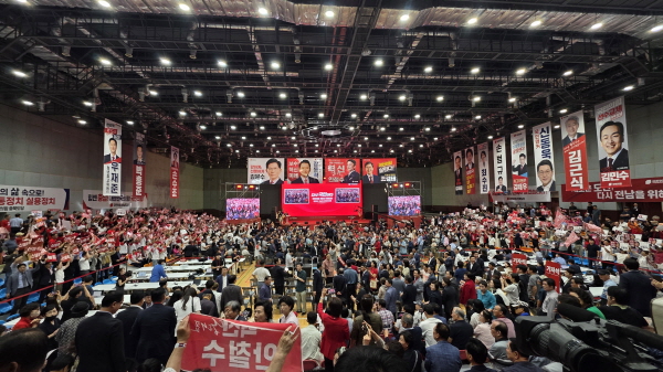 [충청뉴스 김용우 기자] 국민의힘 당 대표 선출을 위한 ‘충청권·호남권 합동연설회’도 그야말로 아수라장이었다. 탄핵 찬성파(찬탄)와 탄핵 반대파(반탄) 후보들은 탄핵 책임 공방, 구속된 윤석열 전 대통령 부부와의 관계 등을 놓고 정면 충돌했다.