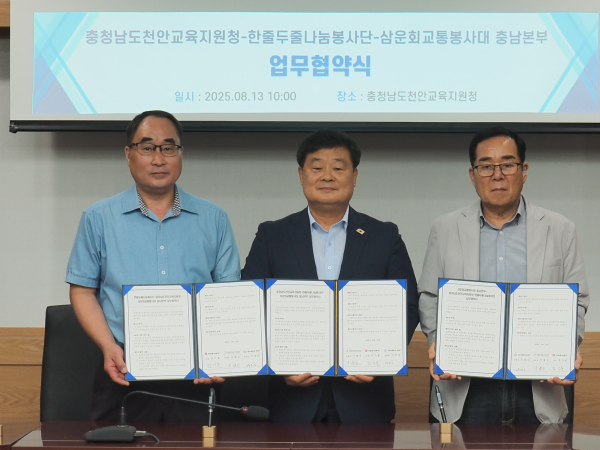 [충청뉴스 유규상 기자] 천안교육지원청(교육장 이병도)은 13일, 한줄두줄나눔봉사단(단장 김기춘), 삼운회교통봉사대 충남본부(본부장 이상인)와 '안전하고 건강한 학교 조성'을 위한 업무협약을 체결했다.