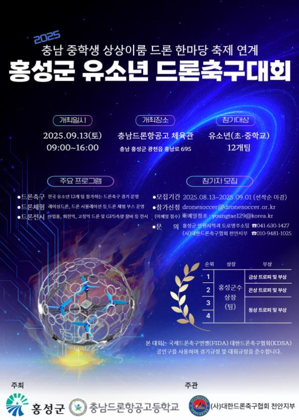 [충청뉴스 박영환 기자] 홍성군은 9월 13일에 ‘2025년 홍성군 유소년 드론축구대회’를 광천읍 충남드론항공고등학교 체육관에서 개최한다고 밝혔다.