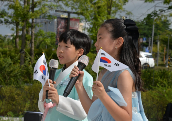 해밀초등학교와 새뜸초등학교 학생 2명이 "대한독립 만세!", "행정수도 만세!" 선창