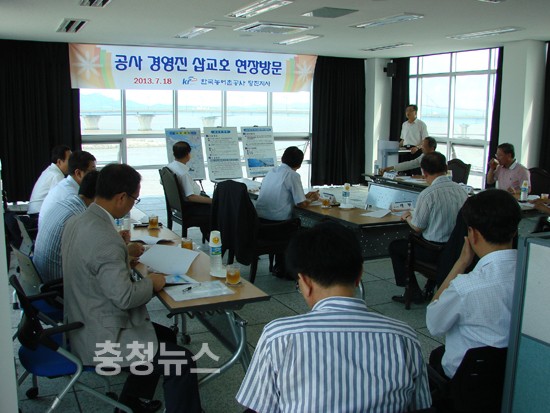 한국농어촌공사 충남지역본부(본부장 박완진)는 18일 오후 공사 비상이사 7명을 삽교호로 초청, 삽교방조제 배수갑문확장사업 현황 설명회를 가졌다.