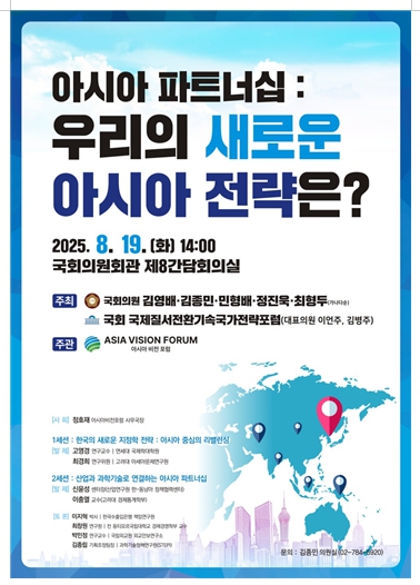 국회의원 김영배, 김종민, 민형배, 정진욱, 최형두 의원(가나다순)과 국회 국제질서전환기속국가전략포럼(대표의원 이언주·김병주)이 공동 주최하고 아시아비전포럼이 주관하는 「아시아 파트너십 세미나 - 우리의 새로운 아시아 전략은?」이 19일 오후 2시 국회의원회관 제8간담회실에서 개최된다.