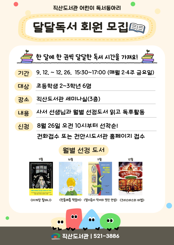 [충청뉴스 유규상 기자] 천안직산도서관(관장 이충미)은 오는 9월 12일~ 12월 26일 어린이 독서동아리 ‘달달독서’를 운영한다.