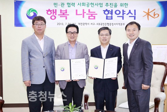 대전광역시 서구(구청장 박환용)는 24일 구청 다목적실에서 KB국민은행 충청서지역본부(본부장 홍학기)와 민.관 협력 사회공헌사업 공동 추진을 위한 행복 나눔 협약식을 가졌다.
