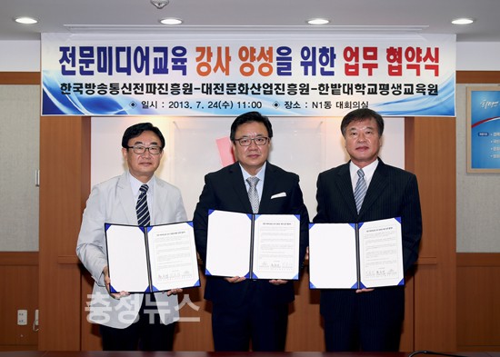 한밭대학교 평생교육원(원장 김철규)은 지난 24일 교내 대학본부(N1동) 2층 대회의실에서 한국방송통신전파진흥원 및 대전문화산업진흥원과 함께 ‘대전지역 미디어교육 강사양성을 위한 다자간 업무협약’을 체결했다.