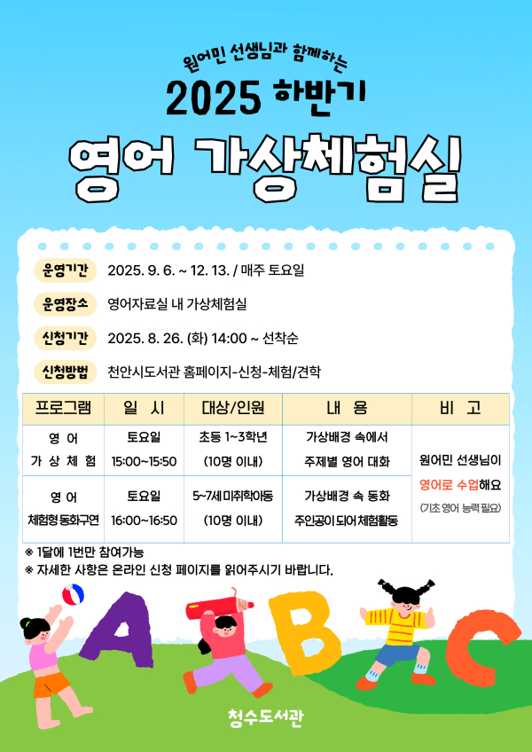 [충청뉴스 유규상 기자] 천안청수도서관(관장 유정희)은 오는 9월 6일~ 12월 13일 ‘원어민과 함께하는 영어 가상체험실 프로그램’을 운영한다.
