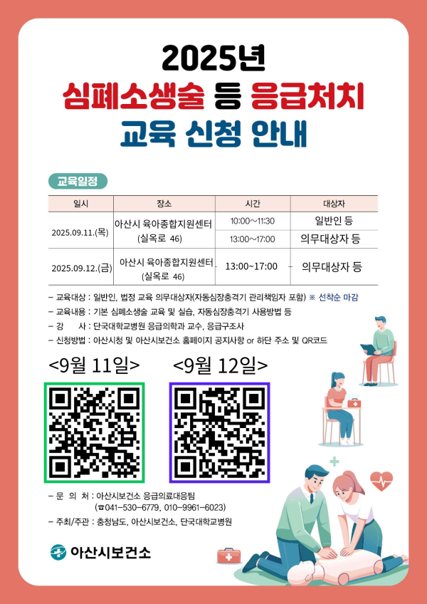 교육일정은 ▲9월 11일 오전 10시 일반인 과정, 오후 1시 의무대상자 과정 ▲9월 12일 오후 1시 의무대상자 과정 등 총 3회 진행되며, 교육장소는 아산시 육아종합지원센터(실옥로 46) 3층 대강당이며, 신청은 아산시청 및 아산시보건소 홈페이지 공지사항 ‘9월 심폐소생술 등 응급처치 교육’에서 가능하다.
