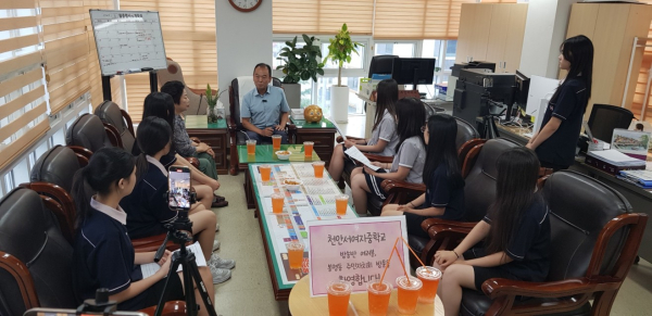 [충청뉴스 유규상 기자] 천안서여자중학교(교장 김수동) 방송부 ‘소리날개’ 학생들은 지난 8월 28일 봉명동 행정복지센터에서 봉명동장과 주민자치회장 및 운영위원을 대상으로 ‘마을 인터뷰 영상’을 촬영했다.