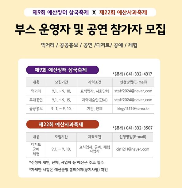 무대공연은 장르 구분 없이 20분 내외의 공연이 가능한 최근 1년 이상 활동 실적이 있는 관내 예술인 및 단체를 15개팀 내외로 모집하며, 사과축제 판매부스는 예산사과를 주제로 한 디저트·공예품·체험 프로그램을 운영할 관내 요식업자와 공예·체험 사업자 10개팀을 모집한다.