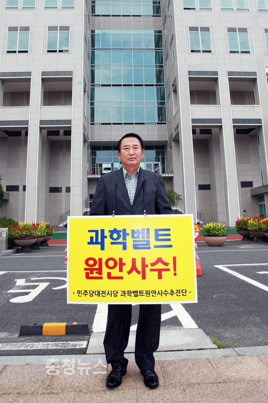 대전 유성구의회 윤주봉 의장이 5일 과학벨트 원안사수를 위한 1인시위를 벌였다.