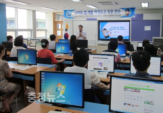 세종시교육청 교사들의 스마트교육에 대한 열정이 수그러들 기미가 보이지 않는다. 교육청은 더위가 한창인 요즘 초.중.고 교사 23명이 도담고에서 스마트교육에 활용할 수 있는 다양한 교수-학습 애플리케이션 개발 프로그램 직무연수에 한창이라고 밝혔다.
