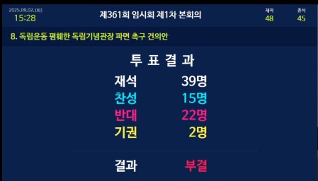 도의회는 2일 오후 제361회 임시회 제1차 본회의에서 안장헌 의원(민주·아산5)이 대표 발의한 '독립운동 폄훼한 독립기념관장 파면 촉구 건의안'에 대해 표결을 진행했으나 재석 39명 중 찬성 15명, 반대 22명, 기권 2명으로 부결됐다.