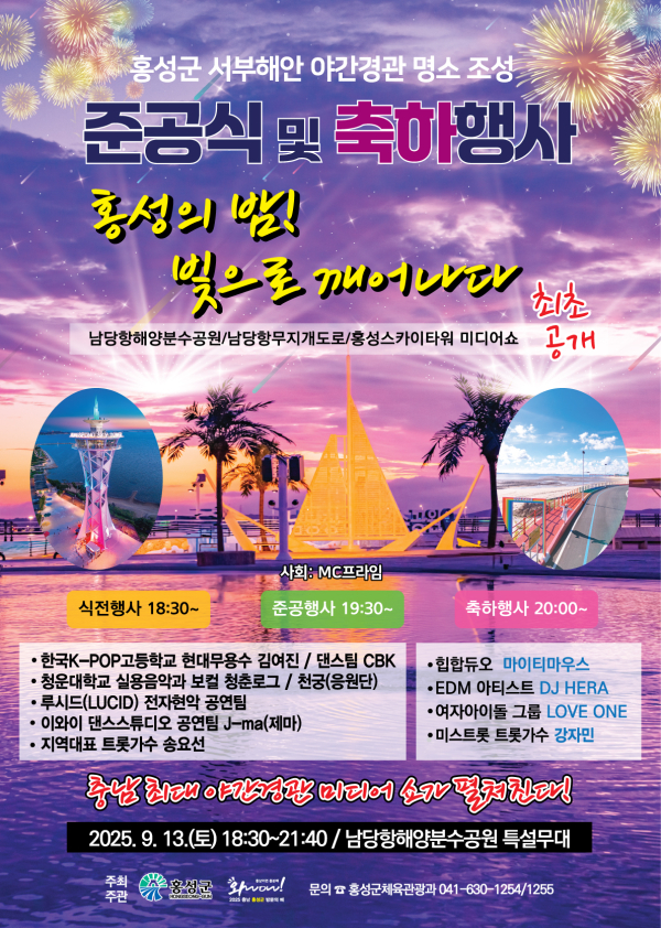 충남권 최대 규모로 조성된 야간경관 조명은 ‘홍성스카이타워’와 ‘남당항 해양분수공원’, ‘남당항 무지개 도로’ 세 곳에서 동시에 펼쳐지며 최첨단 미디어 기술을 활용해 서해안의 아름다운 밤바다와 어우러져 화려한 볼거리를 제공할 예정이다.