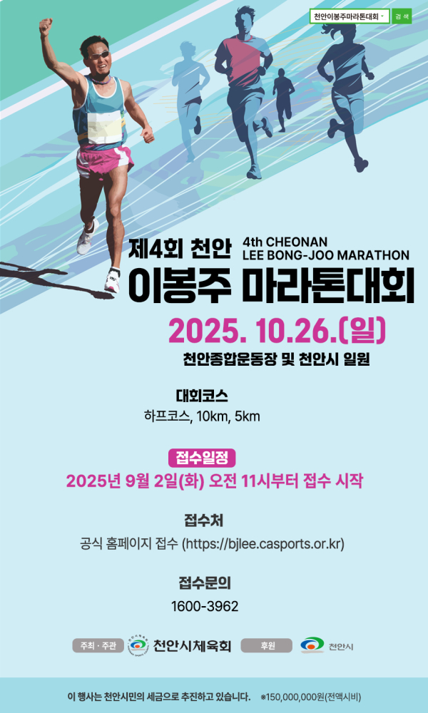 한남교 천안시체육회장은 “접수 시작과 동시에 마감된 것은 천안이봉주마라톤대회가 가진 상징성과 매력을 보여주는 결과”라며 “참가자 모두가 최고의 컨디션에서 달릴 수 있도록 철저한 준비에 최선을 다하겠다”고 밝혔다.