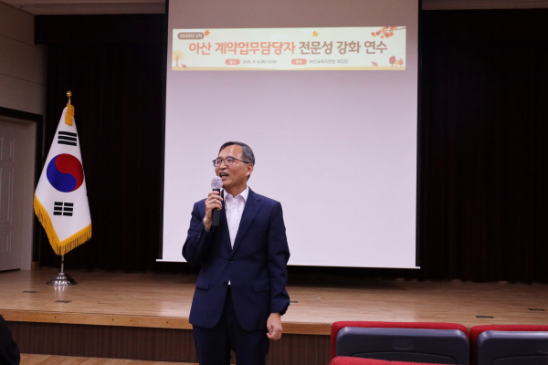[충청뉴스 유규상 기자] 아산교육지원청(교육장 신세균)은 4일 아산교육지원청 3층 대강당에서 관내 계약업무 담당자 및 계약업무 학습공동체 회원 100여 명을 대상으로 『2025년 아산 계약업무담당자 전문성 강화 연수(2차)』를 실시했다.