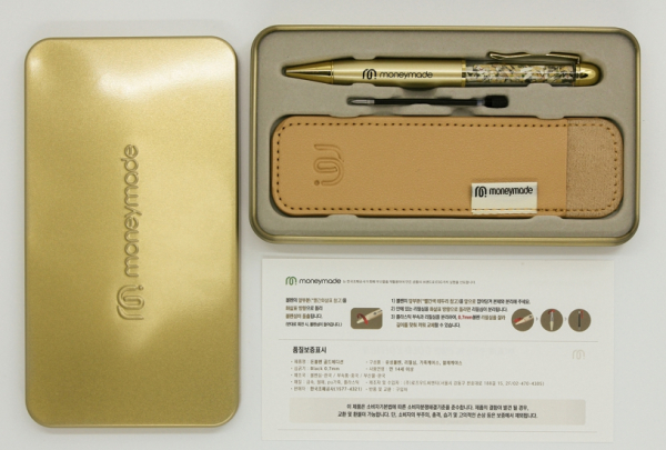 구성품으로는 본품, 리필심, 그리고 휴대용 가죽 케이스가 포함되어 있으며, 모든 구성품에 조폐공사의 화폐 부산물 브랜드인 '머니메이드(moneymade)' 로고가 새겨져 있다.