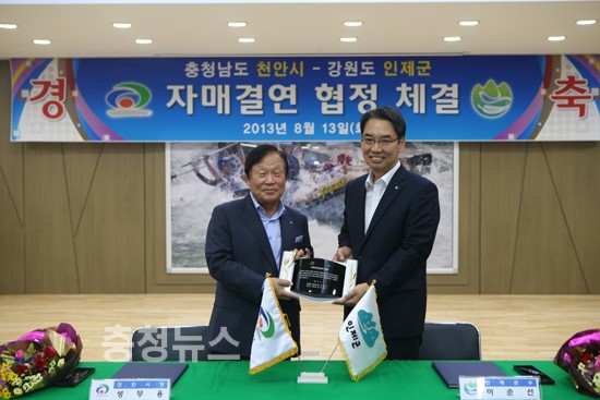 천안시와 강원도 인제군은 13일 오전 인제군청 대회의실에서 양 자치단체 기관·단체장, 시의원, 기자단 및 관련 공무원 등 80여명이 참석한 가운데 지방자치단체간 상생발전과 공동협력을 위한 자매결연 협정 체결식을 가졌다.