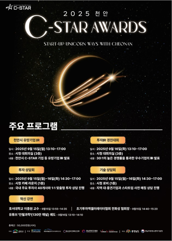김석필 천안시 권한대행 부시장은 “C-STAR Awards가 전국의 유망 스타트업이 참여하는 대표적인 창업 경연의 장으로 성장했다”며, “천안이 창업 허브 도시로 도약하기 위해 스타트업 인프라 확충을 비롯한 다각적인 창업 지원 정책을 추진해 창업생태계의 선순환 체계를 공고히 하겠다”고 말했다.