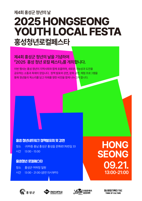 이용록 홍성군수는 “홍성의 청년들은 행사의 손님이 아니라 기획자이자 주인공”이라며, “청년이 만들어가는 로컬페스타가 새로운 청년문화 모델이 되어 많은 청년들이 영감을 얻고, 서로를 응원하는 자리가 되기를 바란다”고 전했다.
