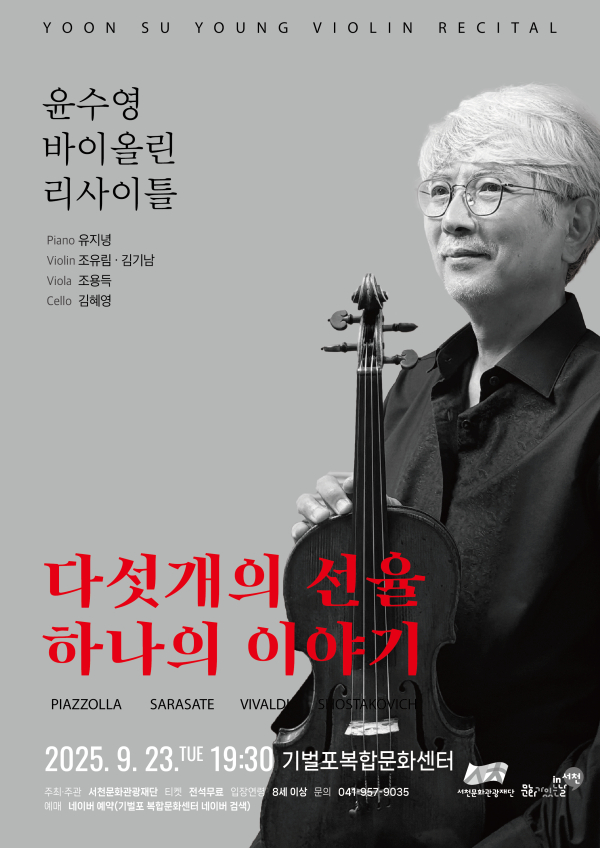 [충청뉴스 서천 = 조홍기 기자] (재)서천문화관광재단은 오는 23일 기벌포복합문화센터에서 「문화가 있는 날 in 서천 – 다섯 개의 선율, 하나의 이야기!」를 개최한다고 밝혔다. 이번 무대는 세계적인 명성을 지닌 바이올리니스트 「윤수영 리사이틀」로 꾸며져 군민들에게 특별한 클래식 향연을 선사할 예정이다.