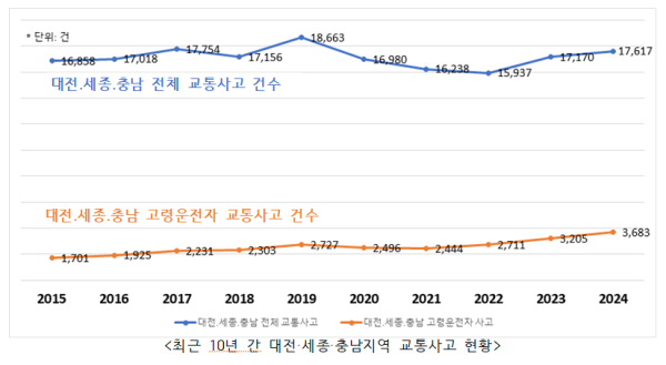 한국도로교통공단 대전·세종·충남지부(본부장 명묘희)가 교통사고 빅터이터를 분석한 결과, 대전·세종·충남지역의 고령운전자(만 65세 이상) 교통사고는 지난 2015년 1천701건에서 2024년 3천683건으로 10년 만에 2.2배 증가했다.