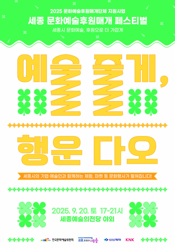 [충청뉴스 최형순 기자] 세종시문화관광재단(대표이사 박영국)은 오는 20일 금요일, 세종예술의전당 야외광장에서 문화예술후원 매개 페스티벌 ‘예술 줄게, 행운 다오’를 개최한다.