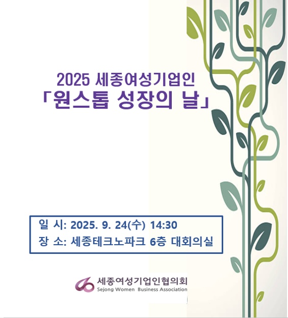 [충청뉴스 최형순 기자] 세종여성기업인협의회(회장 이연재)는 오는 24일 수요일 오후 2시 30분, 세종테크노파크 6층 대회의실에서 '2025 세종여성기업인 원스톱 성장의 날'을 개최한다.