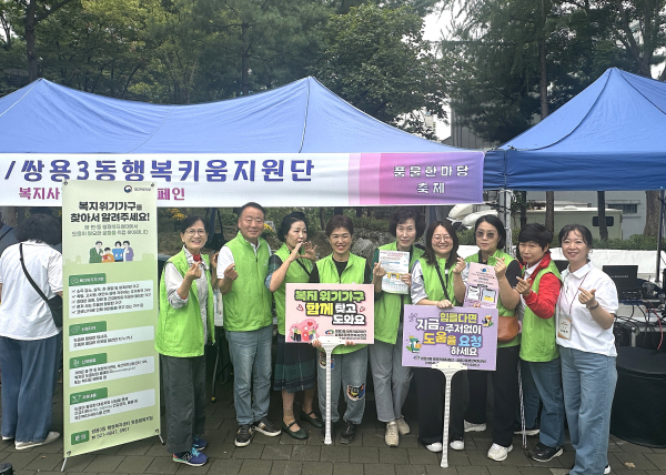 행사장에는 쌍용3동 행복키움지원단이 ‘복지사각지대 발굴 캠페인’ 홍보 부스를 운영하며 축제 현장을 찾은 주민들에게 명예사회복지공무원 제도와 카카오톡 위기가구 신고시스템 ‘파랑새우체톡’을 안내했다.