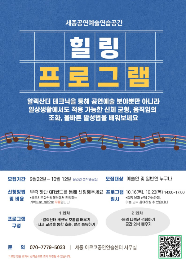 '힐링 프로그램'은 10월 16일(목)과 23일(목) 양일간 진행된다. 한국 알렉산더테크닉협회 전문 강사가 진행하는 이 프로그램은 예술인과 일반인 15명을 대상으로 올바른 자세와 호흡법을 통한 신체 활용법을 가르친다.