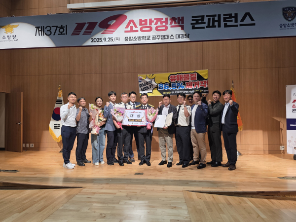 발표자로 나선 이산휘 부여소방서장은 ‘재난현장 유해인자 초기제거를 통한 통합관리체계 구축’을 주제로, Decon Nozzle의 현장적용 사례 및 과학적 검증을 제시한 연구결과로 심사위원들에게 실효성과 현장적응성에 대해 큰 호평을 얻었다.