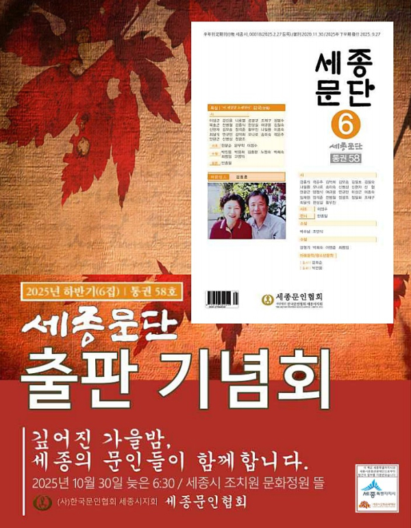 한편, 세종시와 세종시문화관광재단의 지원을 받은 『세종문단』은 오는 10월 30일 오후 6시 30분, 조치원 문화정원 뜰에서 세종문인협회 주관으로 출판기념회를 개최할 예정이다.