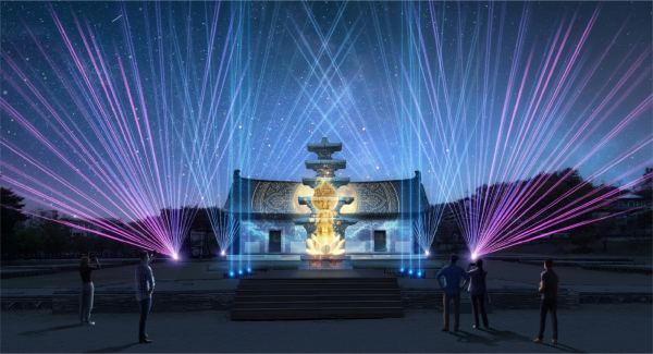 ▲[제2장-기억의 터, 찬란]은 백제의 이상과 기억을 현대적으로 재해석한 공간으로 야외공연장에는 백제금동대향로 조형물을, 광장에는 3면 LED를 설치하고, 박물관 외벽에는 디지털 드로잉 공간을 조성한다. 또한, 박물관 내 카페테리아에서는 목화자단기국 조형물에 바둑돌을 놓는 체험을 할 수 있으며, 야외 잔디밭에서는 사비백제의 산수문양을 표현한 여러 색상의 빛 조형물을 가지고 재미있는 놀이를 할 수 있다.