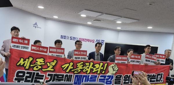 [충청뉴스 최형순 기자] 정부의 세종보 해체 움직임에 맞서 세종보가동추진주민협의체가 30일 세종시청에서 기자회견을 열고 세종보를 즉각 재가동하고 담수하여 비상용수를 확보해야 한다고 강력히 촉구했다.