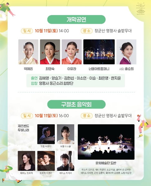 이어 오후 4시에는 '재즈밴드 두빛나래'와 '문화예술단 도반'이 참여하는 ‘구절초 음악회’가 가을밤을 아름다운 선율로 수놓는다.
