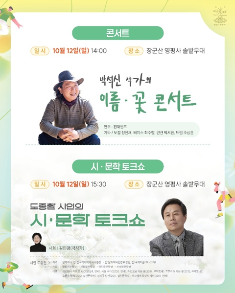 12일(토)에는 문학을 사랑하는 이들을 위한 특별한 프로그램이 마련된다. 오후 2시에는 박석신 작가의 ‘이름·꽃 콘서트’가, 오후 3시 30분에는 김인경 극작가의 사회로 한국인이 사랑하는 도종환 시인의 시 문학 토크쇼가 진행되어 관람객들에게 깊은 감동과 사색의 시간을 선사할 예정이다.