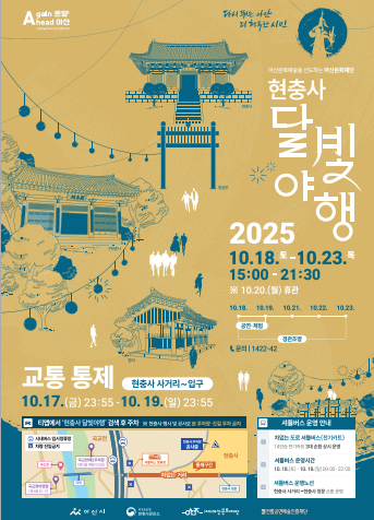 [충청뉴스 유규상 기자] (재)아산문화재단(이사장 오세현)은 오는 10월 18일부터 23일까지 개최되는 ‘2025 현충사 달빛야행’의 원활한 행사 진행을 위해 현충사 사거리부터 현충사 정문까지 차량 통제를 실시한다.