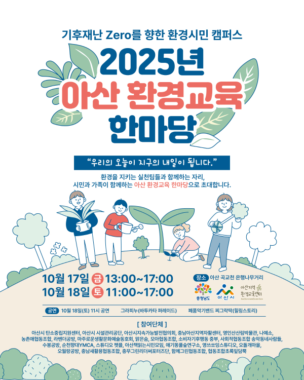 환경교육의 성과는 시민 축제로 이어져 2022년 시작된 ‘환경교육 한마당’은 해마다 참여 규모를 넓히며 시민참여형 행사로 자리 잡았다. 오는 10월 17~18일에는 곡교천 여해나루 일원에서 ‘기후재난 Zero를 향한 환경시민 캠퍼스’를 주제로 ‘2025 환경교육 한마당 및 탄소중립 실천 확산대회’를 열어 아산시와 교육지원청, 27개 협의체 기관이 환경교육도시 지정을 향한 시의 의지와 성과를 공유할 전망이다.