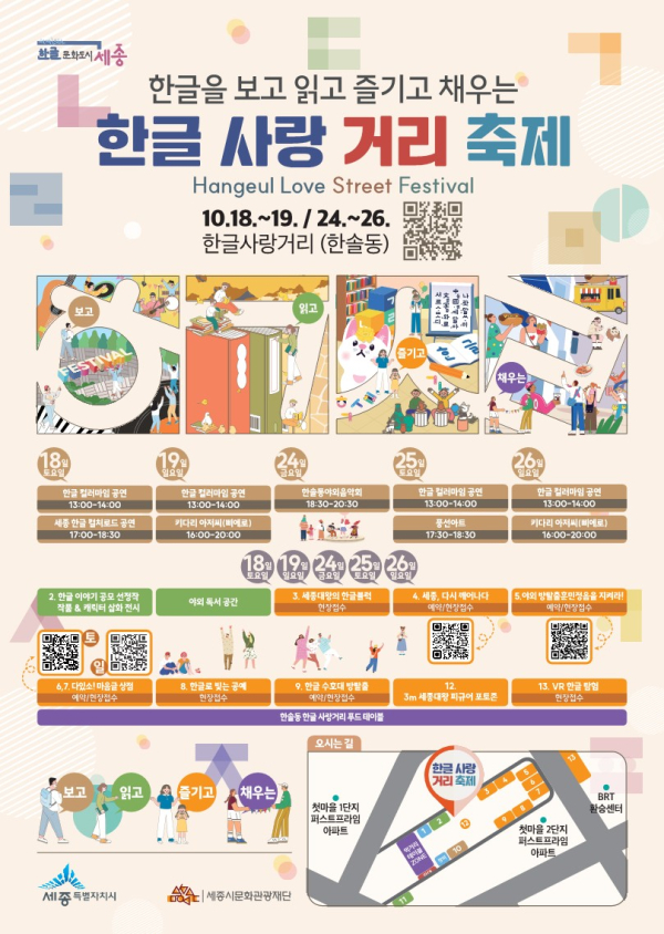 [충청뉴스 최형순 기자] 세종시문화관광재단(대표이사 박영국)은 한글문화도시 세종의 정체성을 담은 '한글 사랑거리 축제'를 오는 10월 18일(토)부터 26일(일)까지 한솔동 한글사랑거리(첫마을 정류장 인근) 일원에서 개최한다.