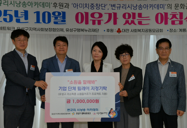 특히, 변규리시낭송아카데미 변규리 원장은 "배워서 남주자"라는 모토 아래, 유성구행복네트워크에 기탁금 100만 원을 전달하며 나눔의 기쁨을 함께했다.