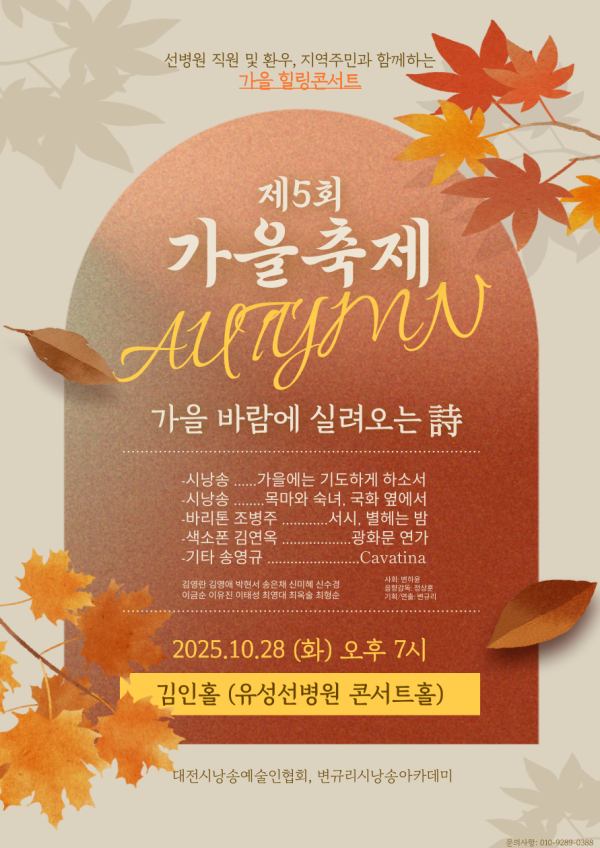 아울러, 오는 28일 오후 7시 유성구 김인홀 콘서트홀에서 열리는 '음악과 시낭송 콘서트 제5회 가을축제'에 많은 관심과 관람을 부탁했다.