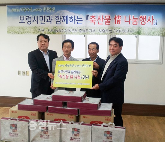 농협 충남지역본부(본부장 김병문)는 10일 보령축협 회의실에서 나눔축산운동 충남도지부(아산축협조합장 맹준재), 보령축협(조합장 윤세중)과 함께 주위의 보살핌을 필요로 하는 소외계층을 찾아 “보령시민과 함께하는 축산물 情 나눔 행사”를 가졌다.