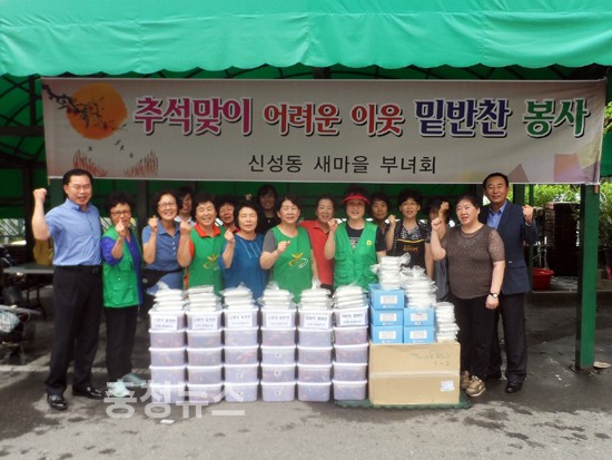 신성동 새마을부녀회가 주최한 이번 행사에는 지역구 의원인 윤주봉 의원과 신성동 주민센터 김일기 동장이 함께 참여했으며 어려운 가정 40세대에 김치, 조기등 100만원 상당의 밑반찬을 정성껏 준비해 전달했다.