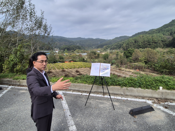 박희조 동구청장이 ‘대청호 장미공원’ 조성 사업 부지에서 추진 현황을 설명하고 있다.