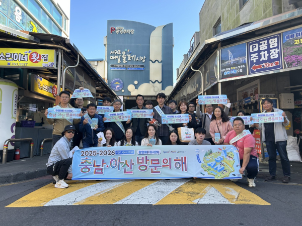 [충청뉴스 유규상 기자] 아산시(시장 오세현)는 지난 23일 서귀포 매일올레전통시장에서 ‘2025~2026 충남·아산 방문의 해’ 홍보 캠페인을 진행했다.