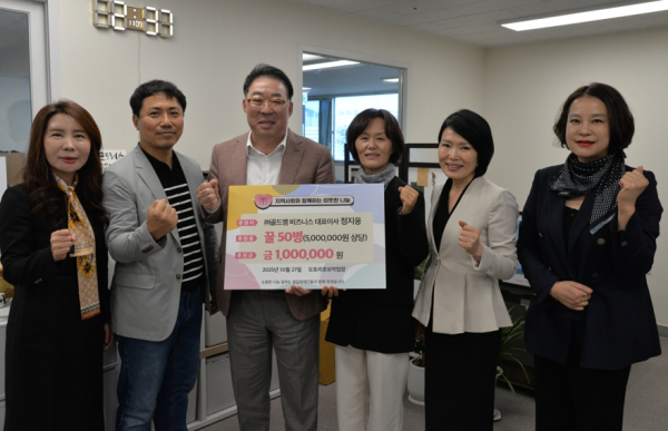 [충청뉴스 최형순 기자] 대전 ㈜골드엠비즈니스 정지웅 대표가 지난 27일 대전 서구에 위치한 도토리보호작업장(원장 장영애)을 방문해 현금 100만 원과 500만 원 상당의 벌꿀을 후원하며 지역사회에 따뜻한 감동을 전했다.